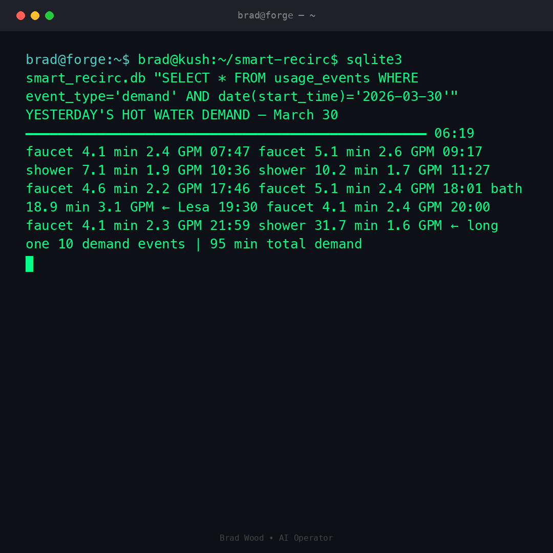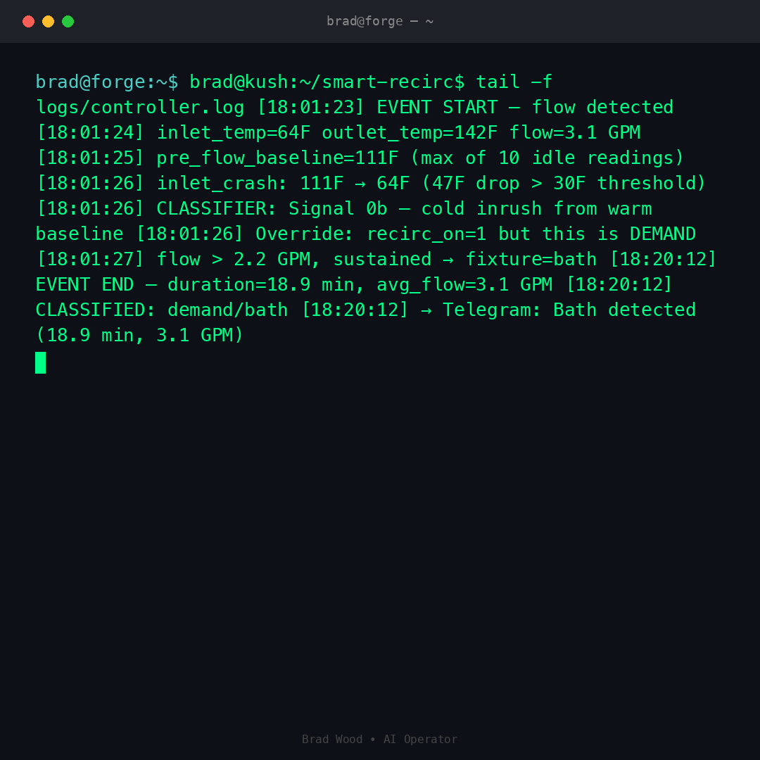 - Bath during recirc was misclassified — cold water beats the flow sensor by a few seconds. Fixed by using the max of the last 10 idle inlet readings as the pre-flow baseline instead of a single reading.