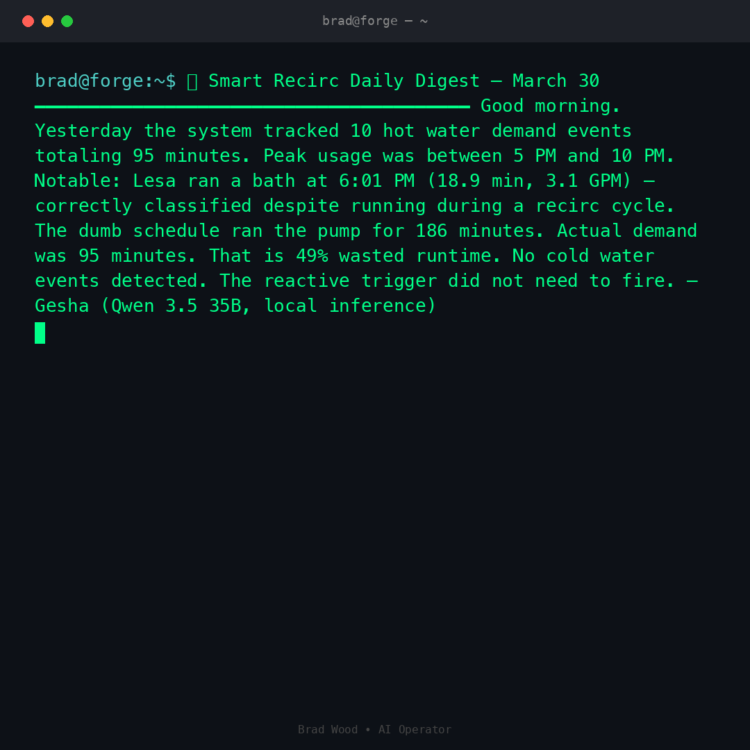 Every morning at 7 AM, the system sends a daily digest: yesterday's events, demand vs recirc ratio, estimated savings, and any anomalies. All narrated by the local AI.