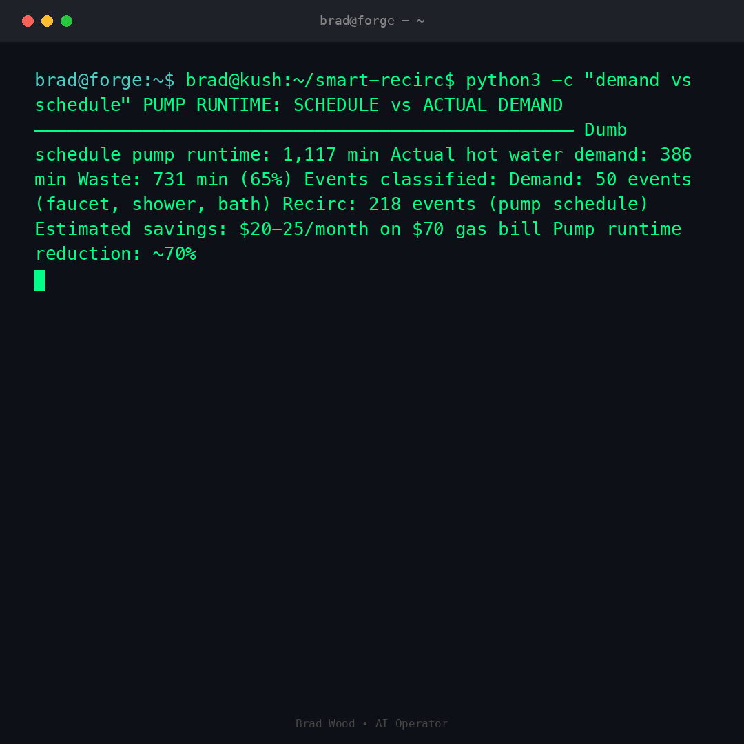 400 feet of copper pipe. When nobody's used hot water for a while, that entire loop goes cold. The Rinnai has a pump that circulates hot water through the loop — but it runs on a dumb schedule. 3x more pump runtime than needed. 20-25/month in wasted gas on a 70 bill.